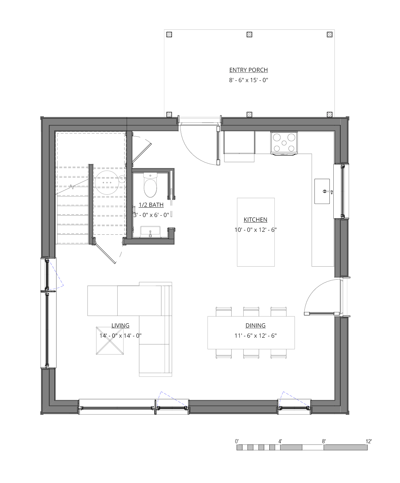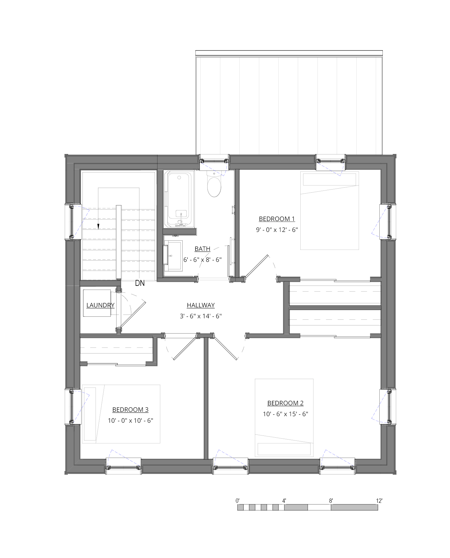 Two-story design with a combined kitchen/living/dining space at the first floor and three bedrooms with a full bath at the second floor.